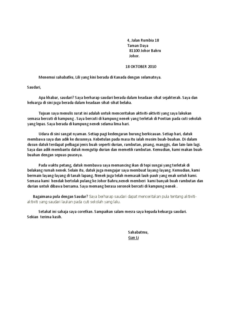 Saya berada di kampung nenek selama lima hari. Contoh surat kiriman rasmi ringkas di 2020 belajar penjara surat kumpulan contoh surat kiriman rasmi rayuan sekolah terbaik 2019. Tujuan saya menulis surat ini ialah untuk menceritakan tentang aktiviti-aktiviti yang telah saya lakukan pada cuti sekolah yang lalu.